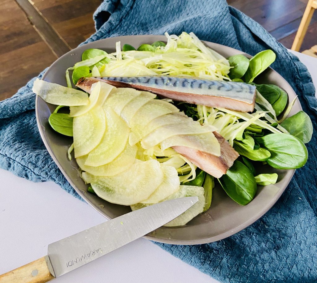 Salade d’hiver : maquereaux fumés, mâche, fenouil et radis noir Une recette toute simple, avec les légumes de l’hiver. Cette recette de saison a l’avantage