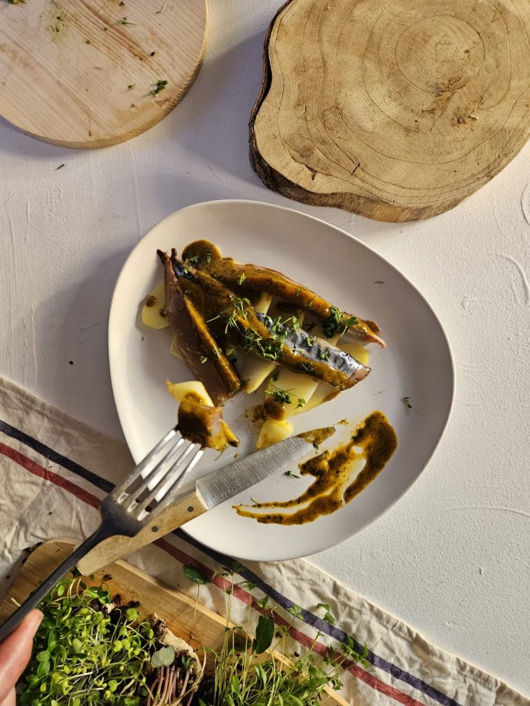 Sauce Capucine gourmande sur maquereau fumé Cette sauce est une base que vous pouvez utiliser avec de nombreuses herbes aromatiques. Ici, c’est la Capucine qui